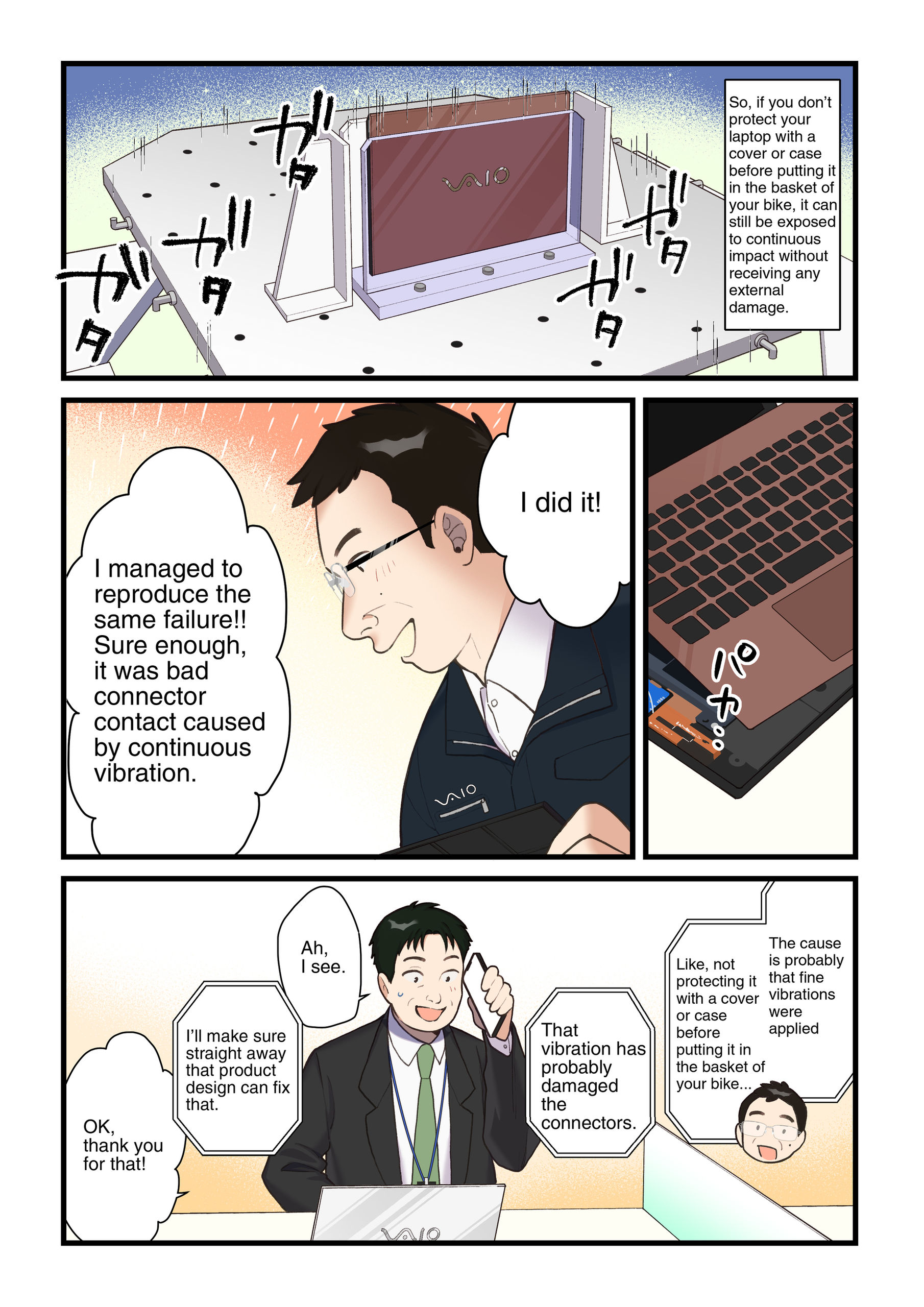 Working on this manga gave me a first look into the behind-the-scenes world of VAIO product development, and it was truly fascinating. I was impressed by how durable the products are, passing a wide range of rigorous quality tests despite their precision. It made me realize that the ability to use them reliably anytime, anywhere is no accident, it’s the result of the team's relentless effort. I was genuinely inspired by their dedication and the high standards they bring to manufacturing.